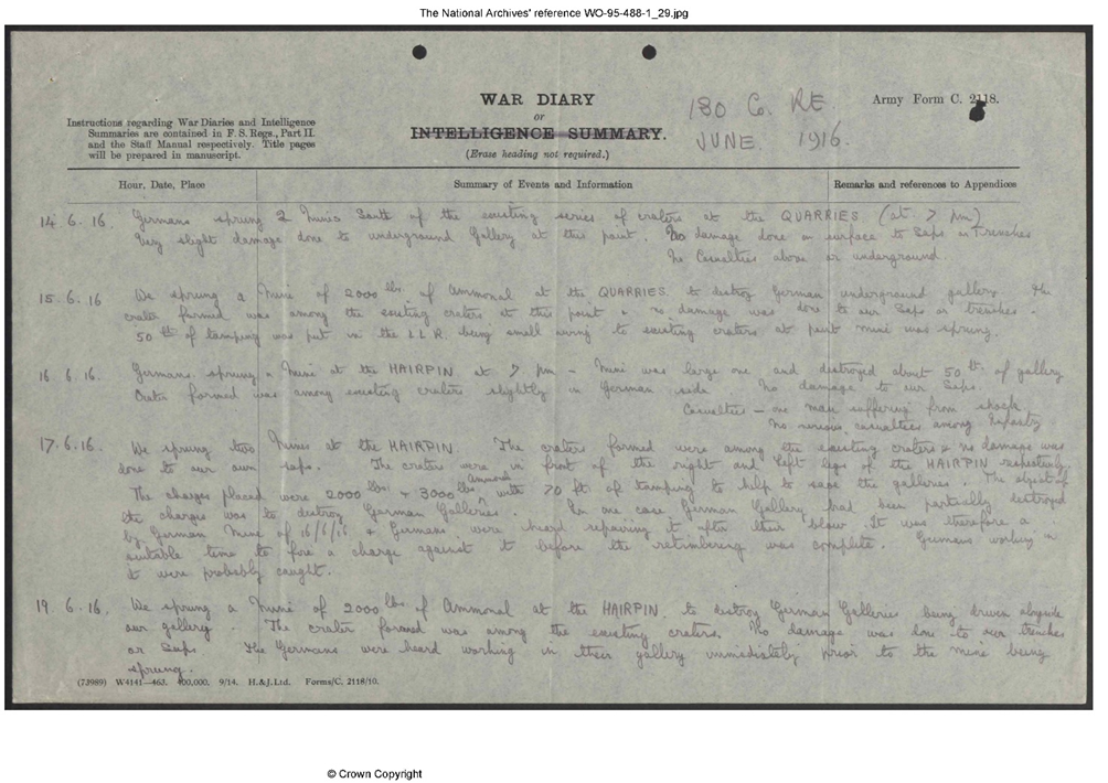 1916 We sprung two mines at the HAIRPIN. The craters formed were among the existing